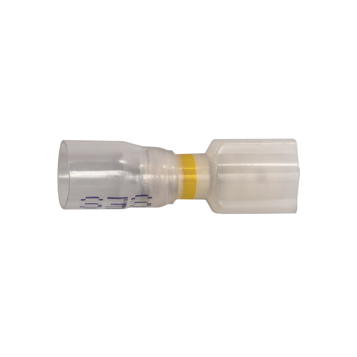 Fully Insulated Quick-Connect Crystal Clear Terminals, Wire Gauge (AWG): 12-10, Color Stripe: Yellow, Tab Size & Thickness: .250″ x .032″ (.80MM), Type: Male