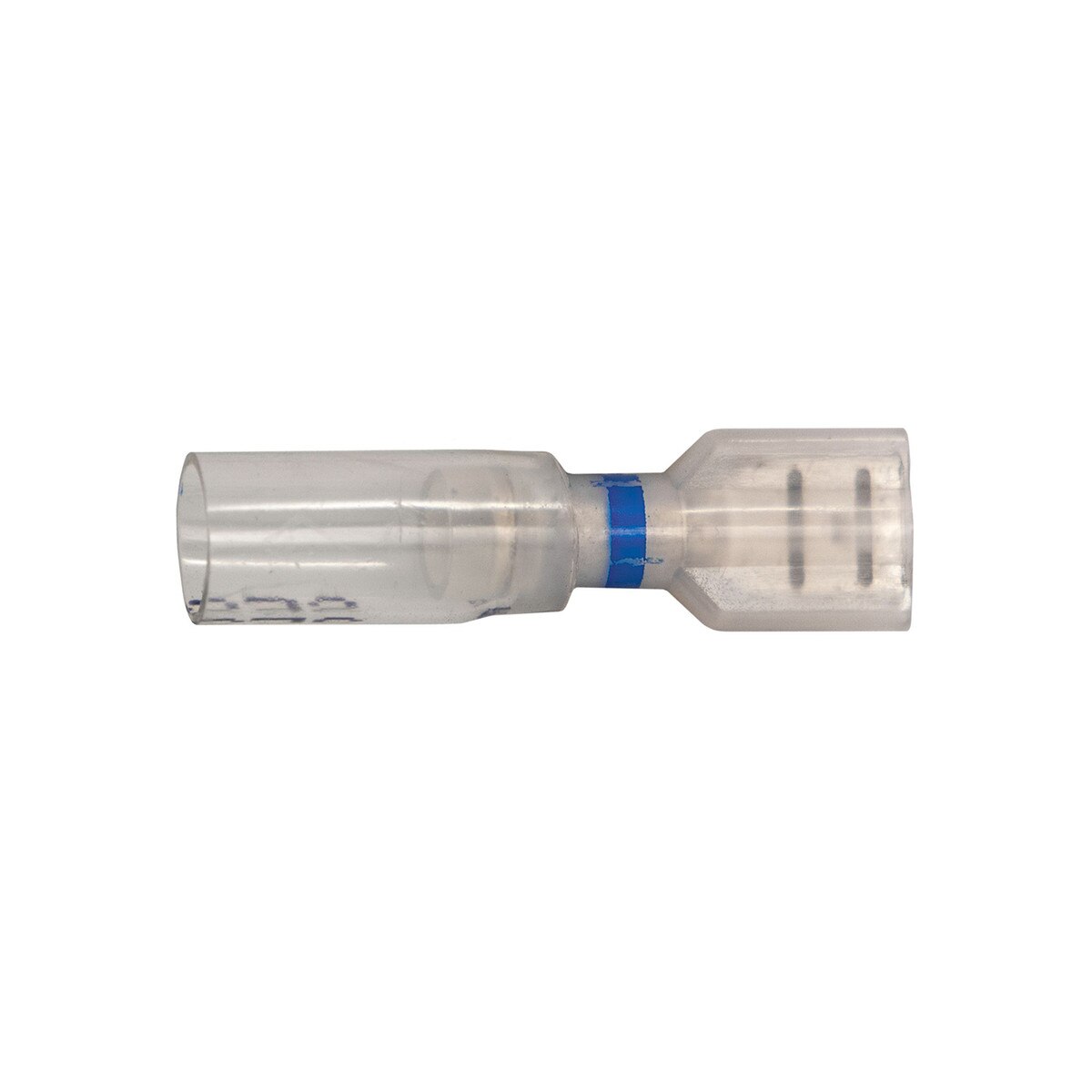 Fully Insulated Quick-Connect Crystal Clear Terminals, Wire Gauge (AWG): 16-14, Color Stripe: Blue, Tab Size & Thickness: .250″ x .032″ (.80MM), Type: Female