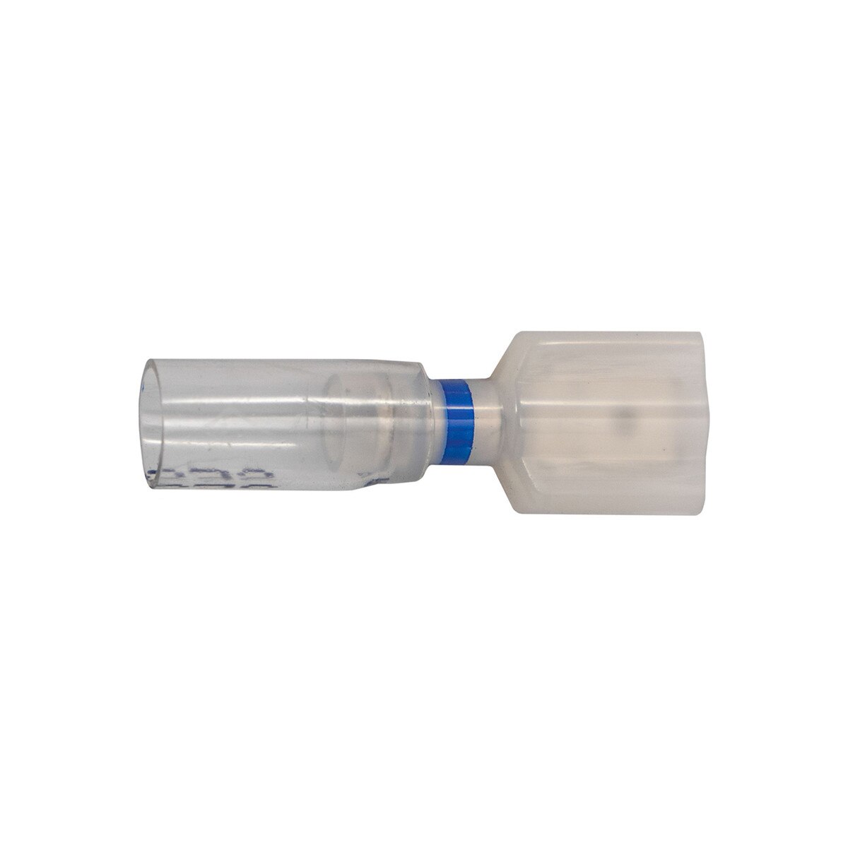 Fully Insulated Quick-Connect Crystal Clear Terminals, Wire Gauge (AWG): 16-14, Color Stripe: Blue, Tab Size & Thickness: .250″ x .032″ (.80MM), Type: Male