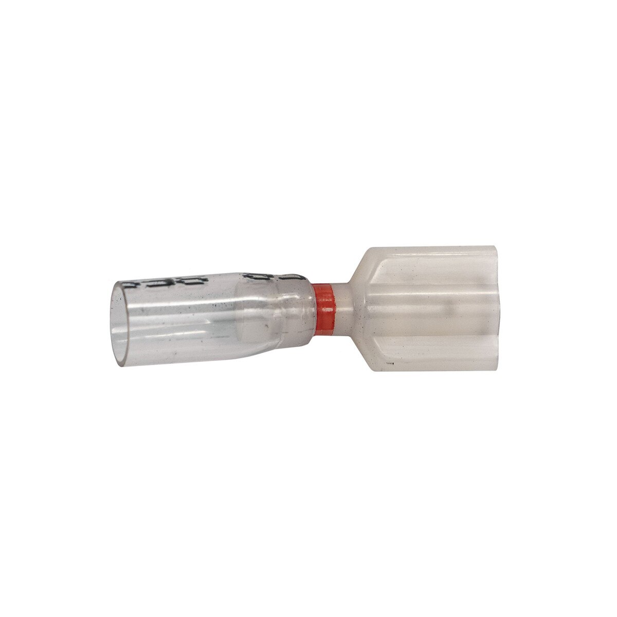 Fully Insulated Quick-Connect Crystal Clear Terminals, Wire Gauge (AWG): 22-18, Color Stripe: Red, Tab Size & Thickness: .250″ x .032″ (.80MM), Type: Male