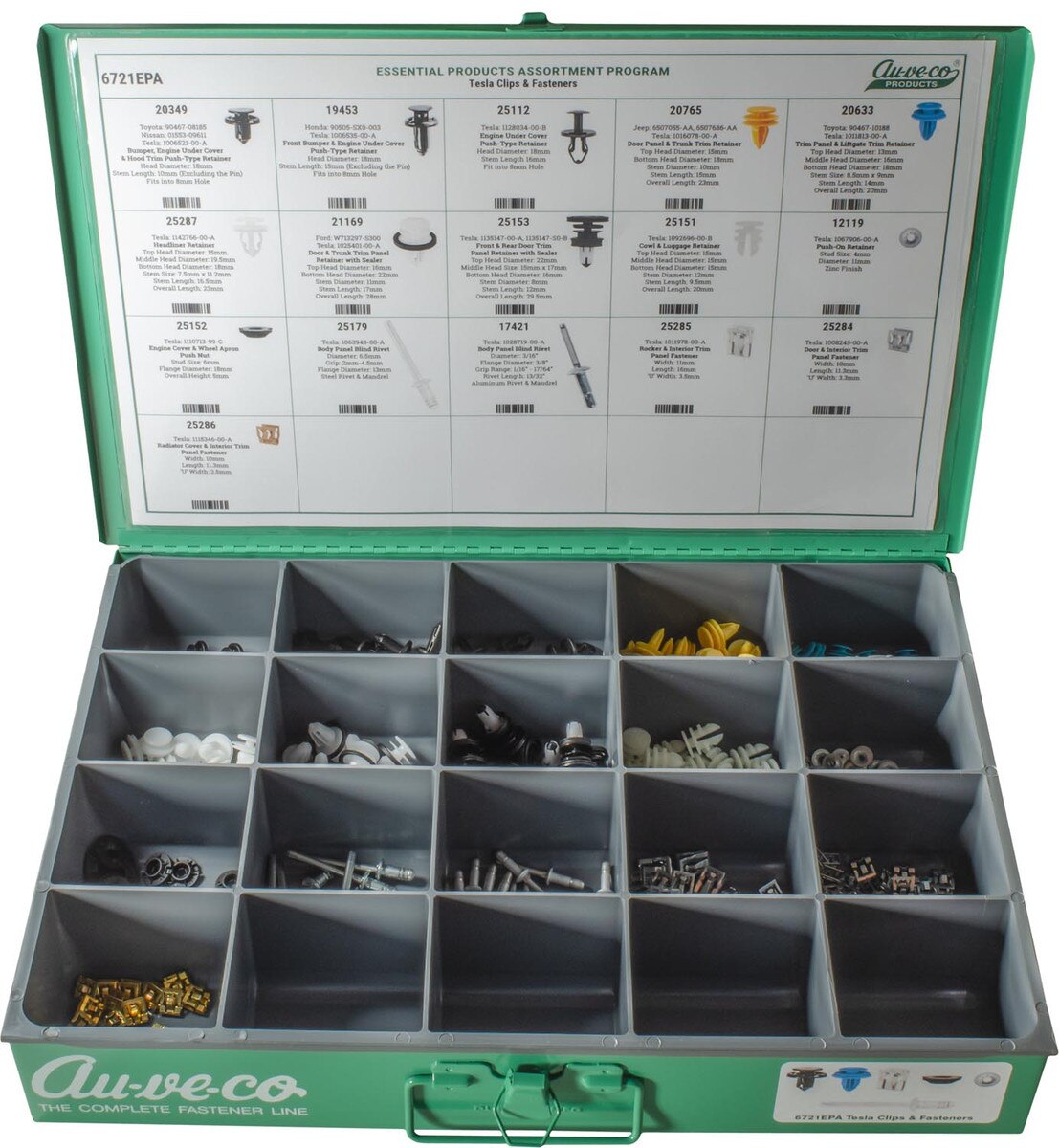 # 20349 ( Bumper, Engine Under Cover & Hood Trim Push-Type Retainer), # 19453 ( Front Bumper & Engine Under Cover Push-Type Retainer), # 25112 (Engine Under Cover Push-Type Retainer), # 20765 (Door Panel & Trunk Trim Retainer), # 20633 (Trim Panel & Liftgate Trim Retainer), # 25287 (Headliner Retainer), # 21169 (Door & Trunk Trim Panel Retainer with Sealer), # 25153 (Front & Rear Door Trim Panel Retainer with Sealer), # 25151 (Cowl & Luggage Retainer), # 12119 (Push-On Retainer), # 25152 (Engine Cover & Wheel Apron Push Nut), # 25179 ( Body Panel Blind Rivet), # 17421 (Body Panel Blind Rivet), #25285 (Rocker & Interior Trim Panel Fastener), # 25284 (Door & Interior Trim Panel Fastener), # 25286 (Radiator Cover & Interior Trim Panel Fastener); Tesla # 100652100A, # 100653500A, # 112803400B, # 101607800A, # 101181300A, # 114276600A, # 102540100A, # 1135147S0B, # 113514700A, # 109269600B, # 106790600A, # 111071399C, # 102871900A, # 106394300A, # 101197800A, # 100824500A, # 111534600A